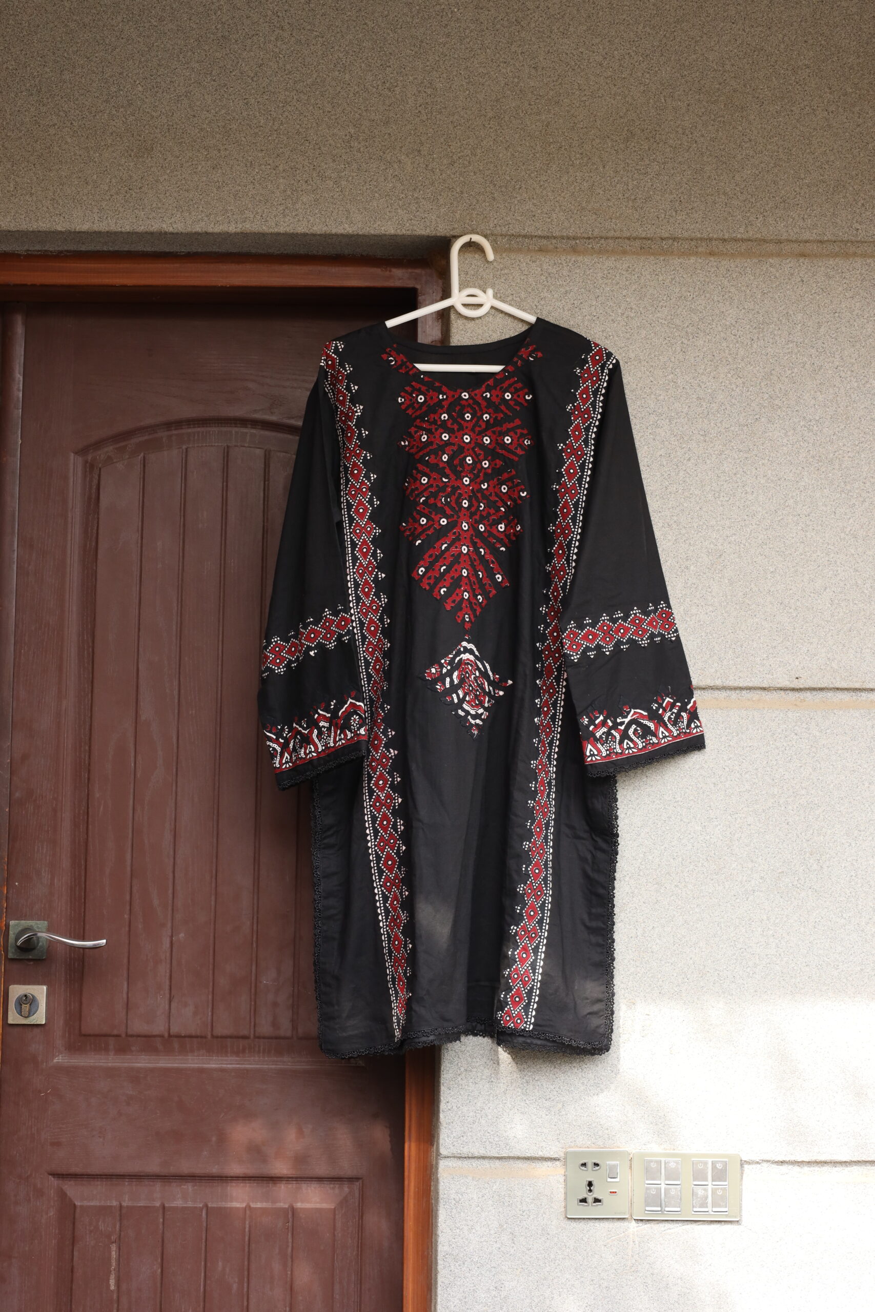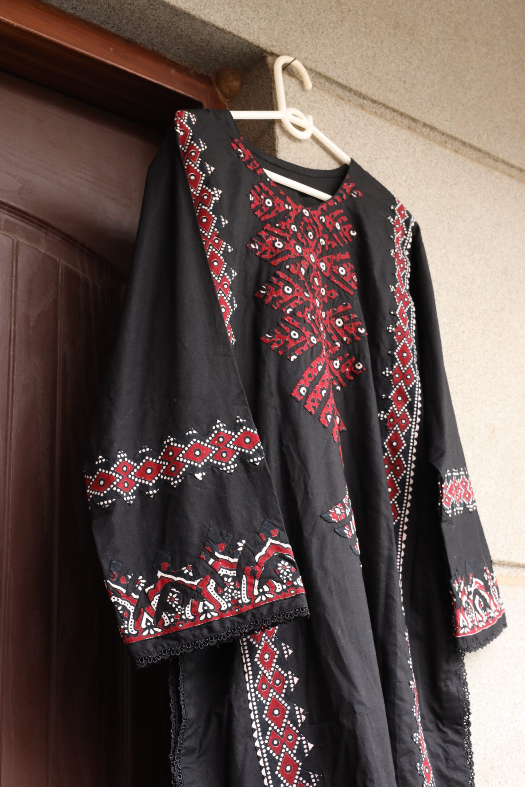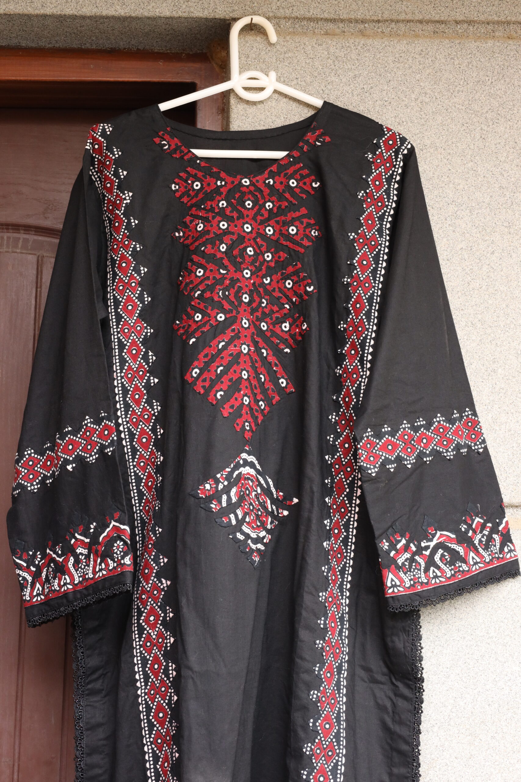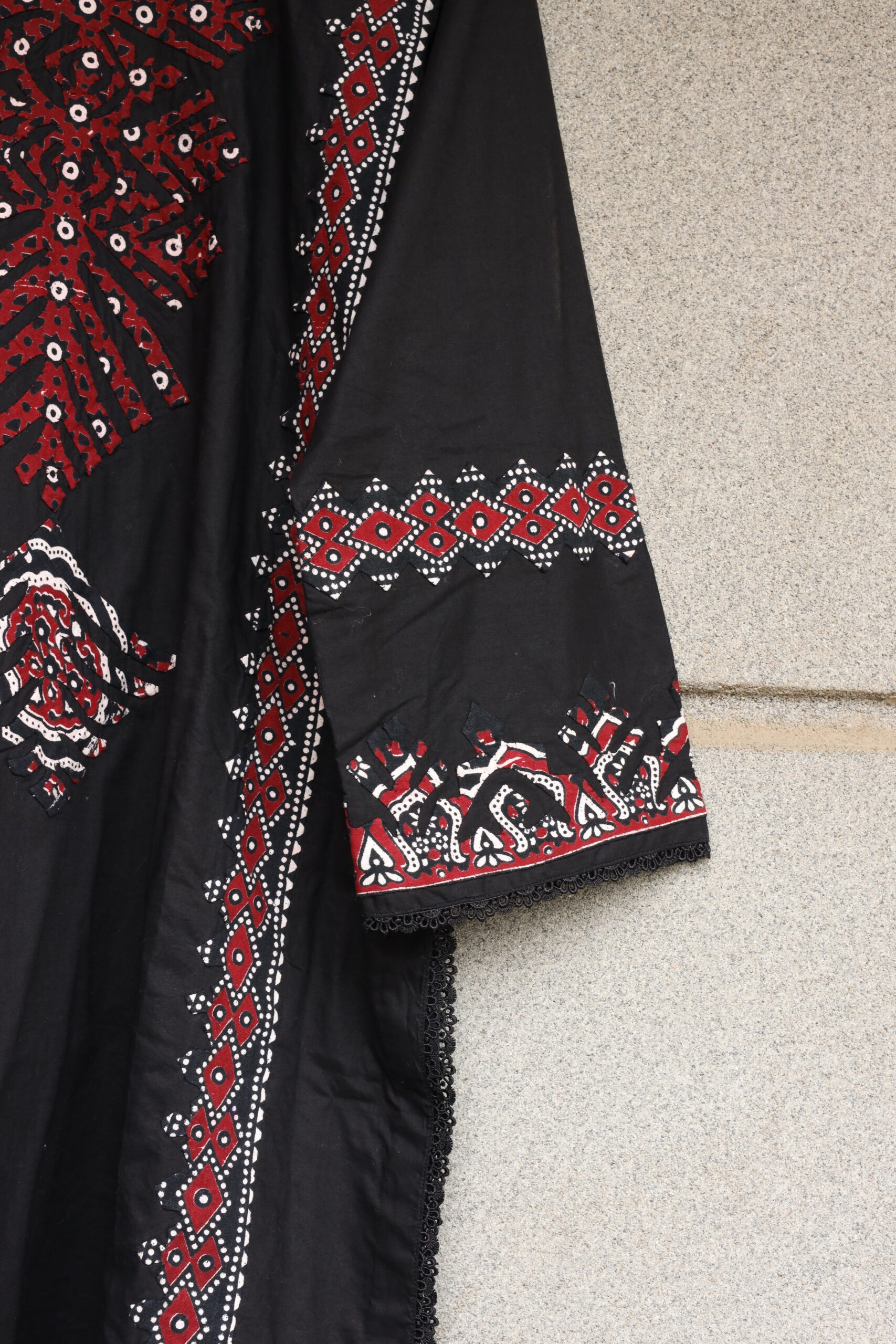 Intricate hand crafted ajrak ralliwork pattern on black base.
