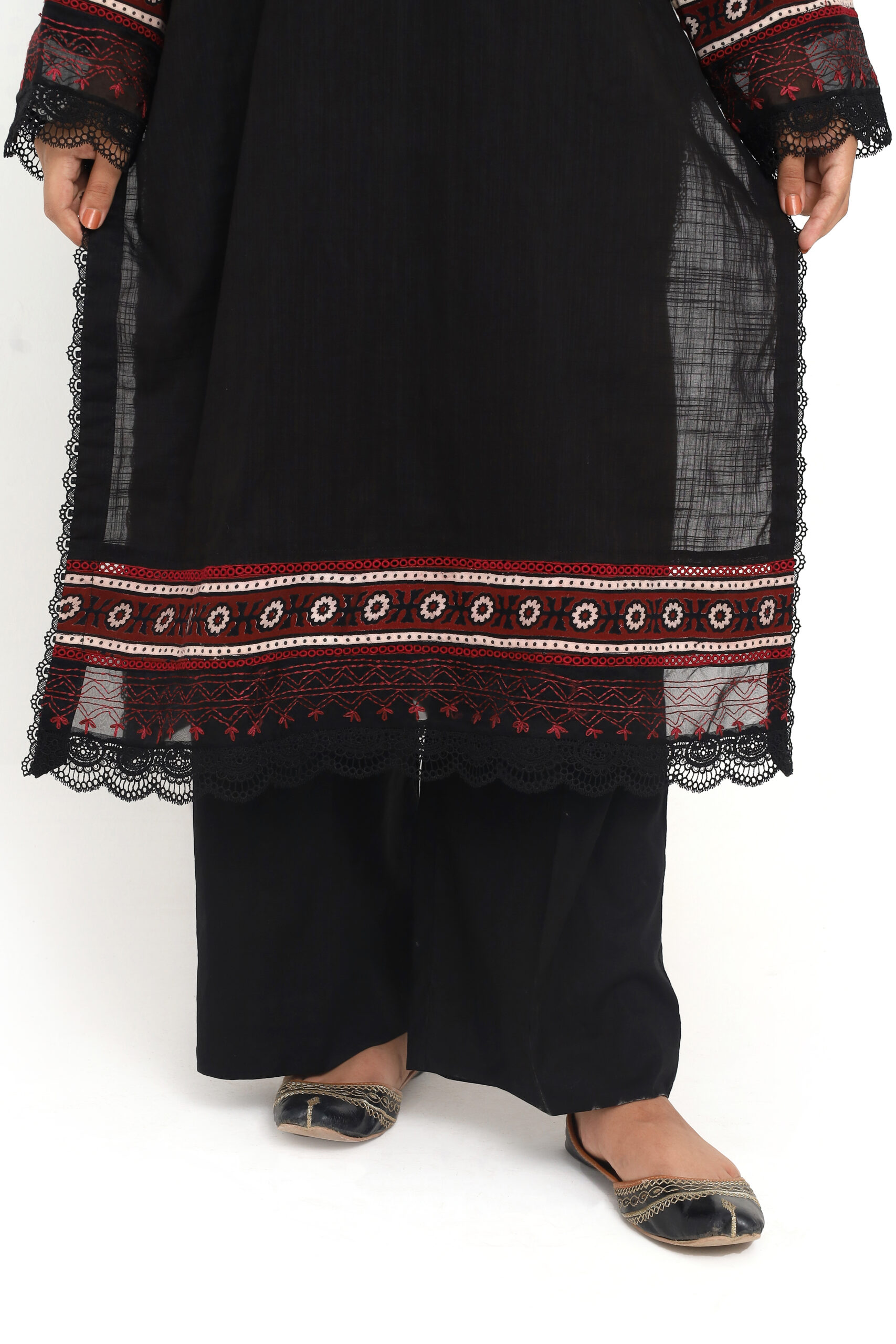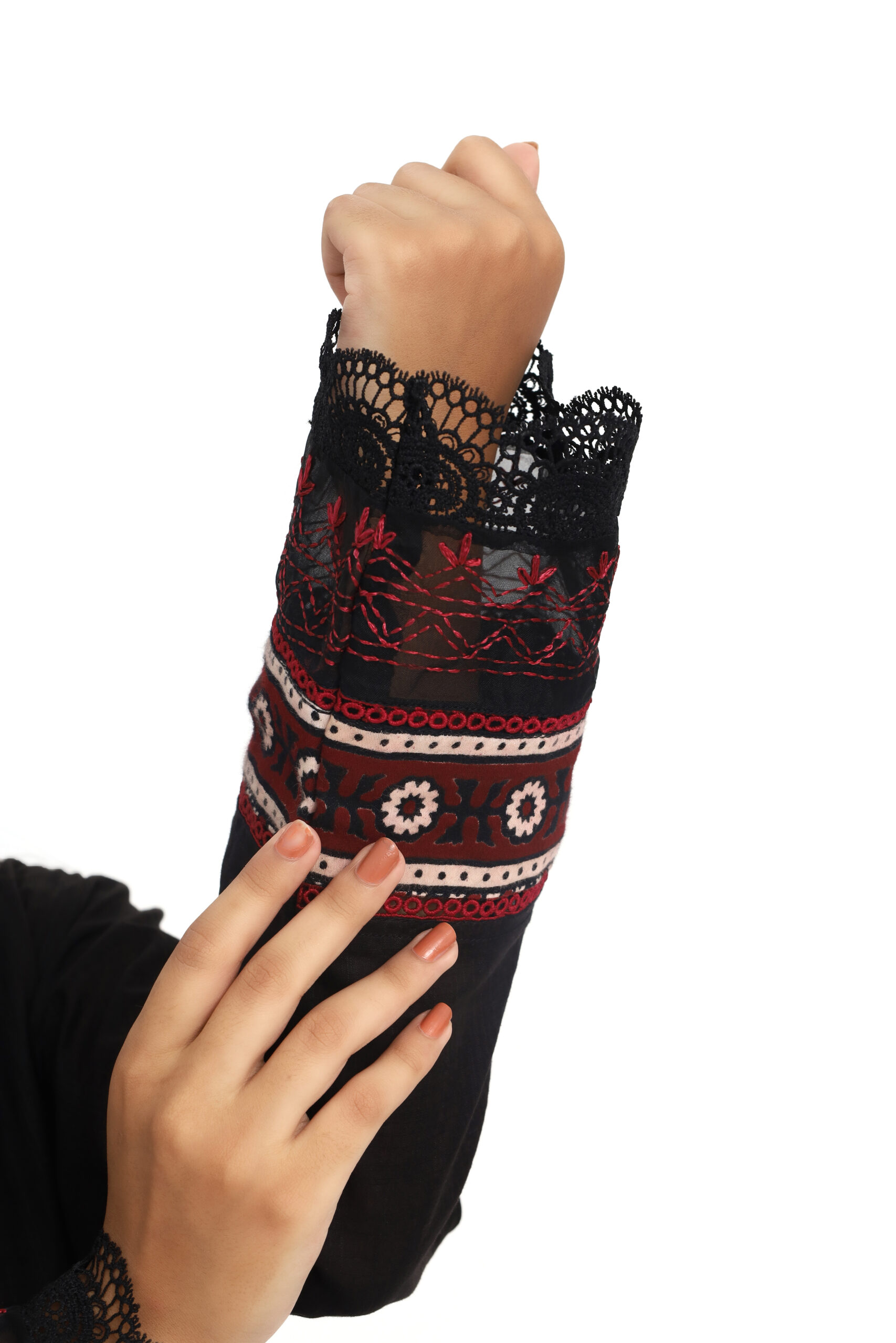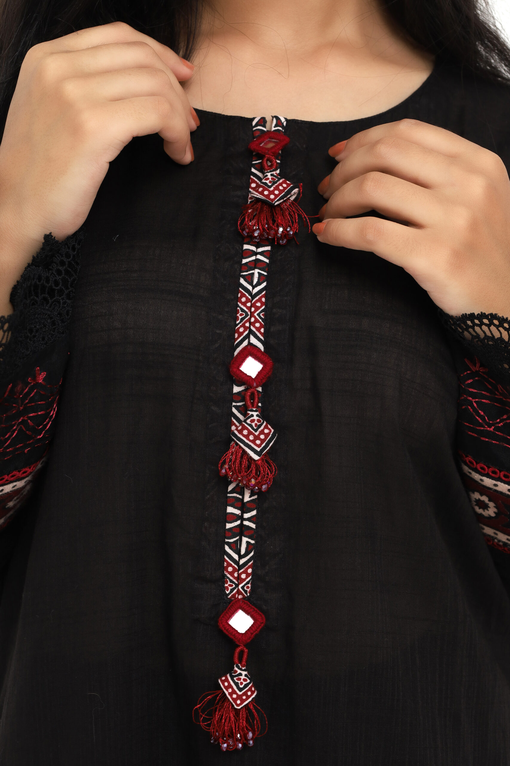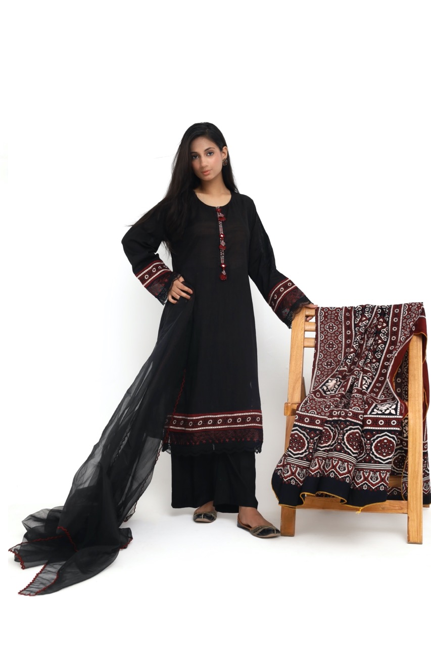 Hand embroidered orgnza and ajrak motif are blended in beautiful pattern on sleeves and shirt damand. Neckline is embelishd with hand made buttons.