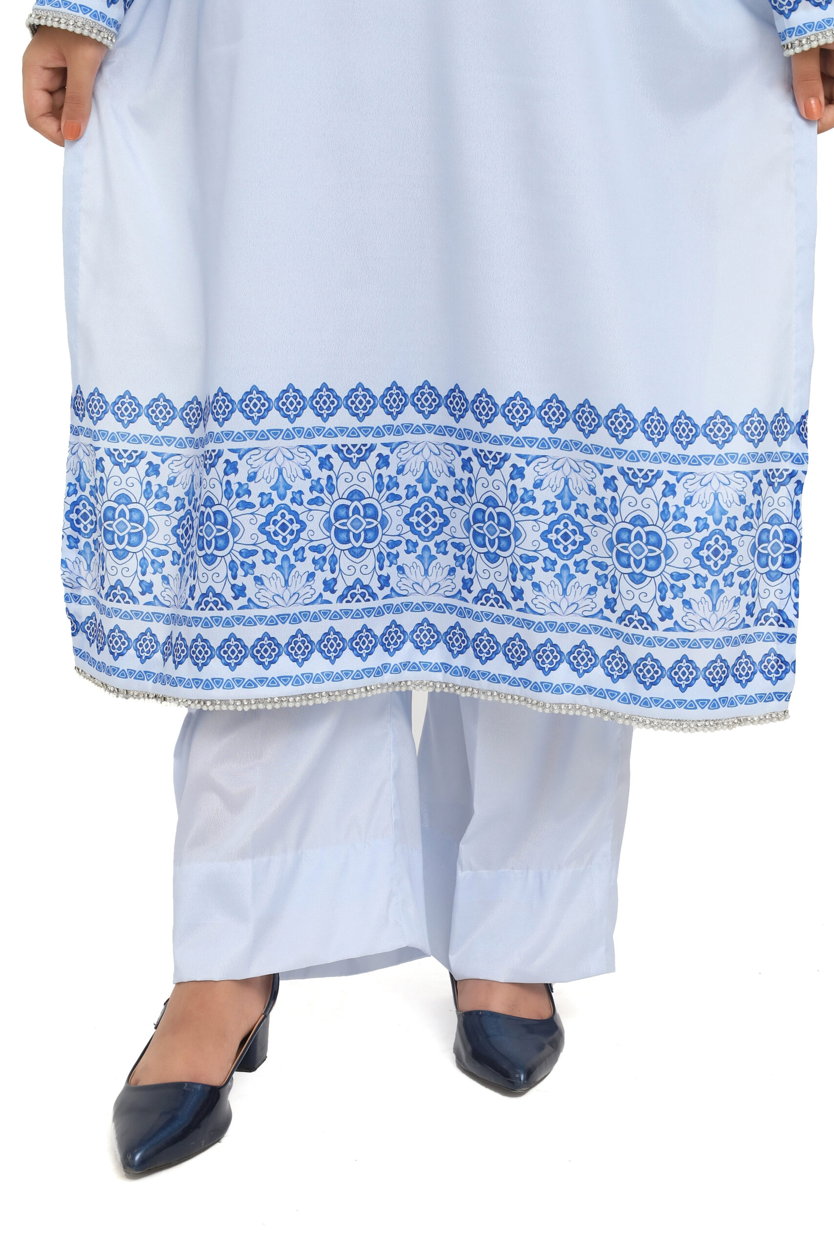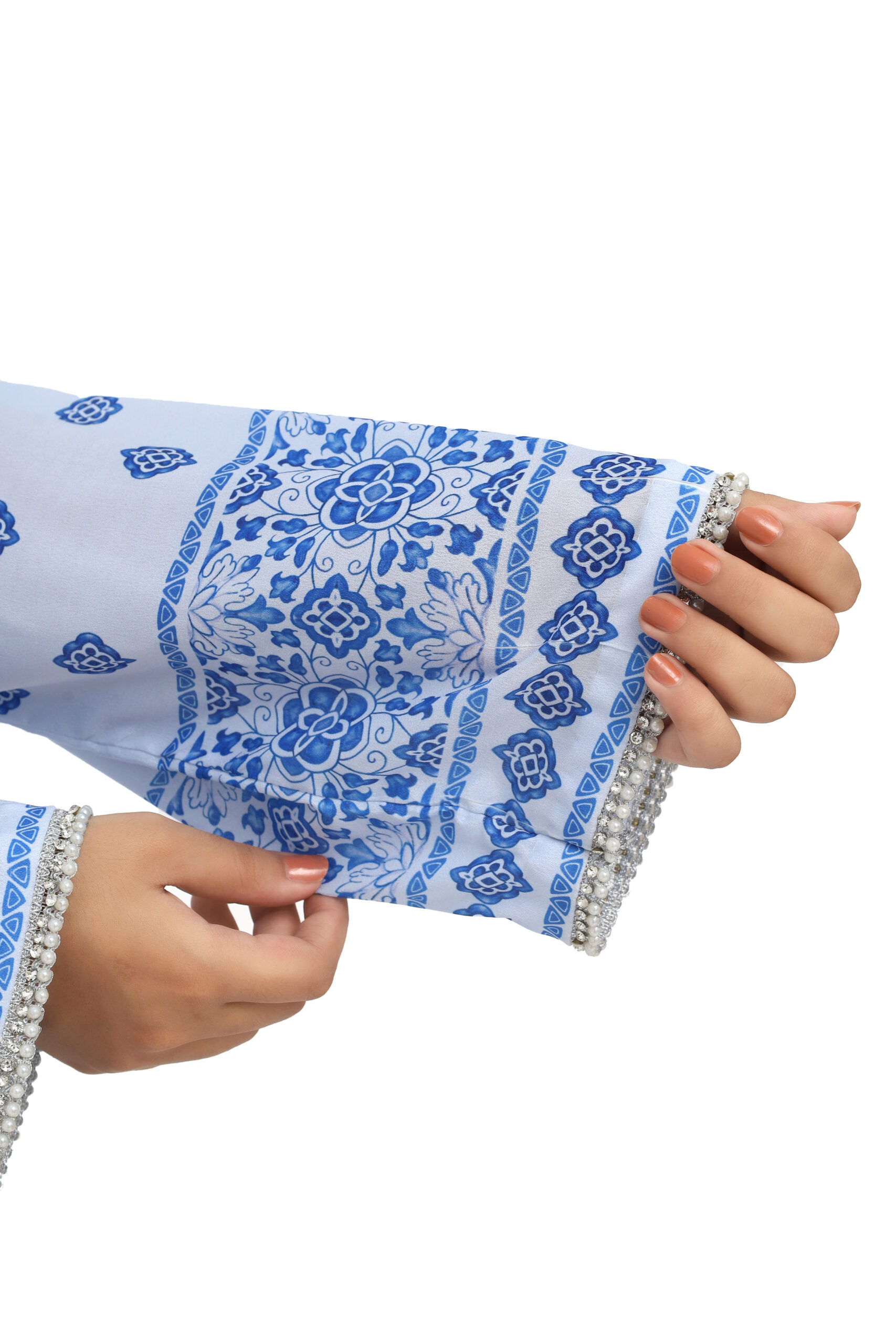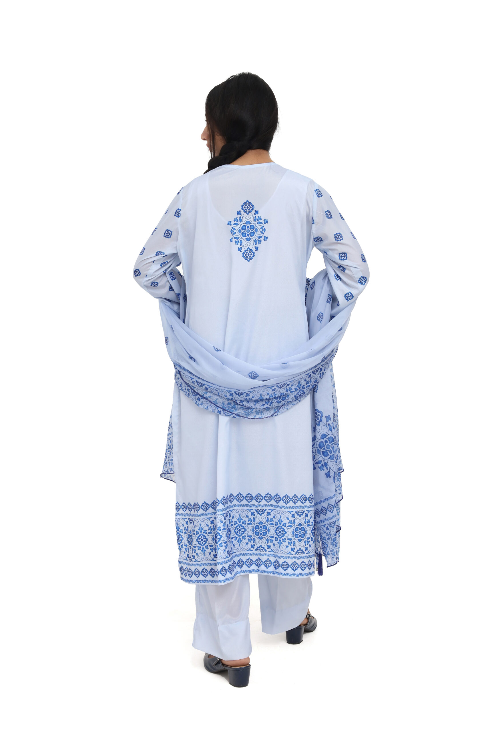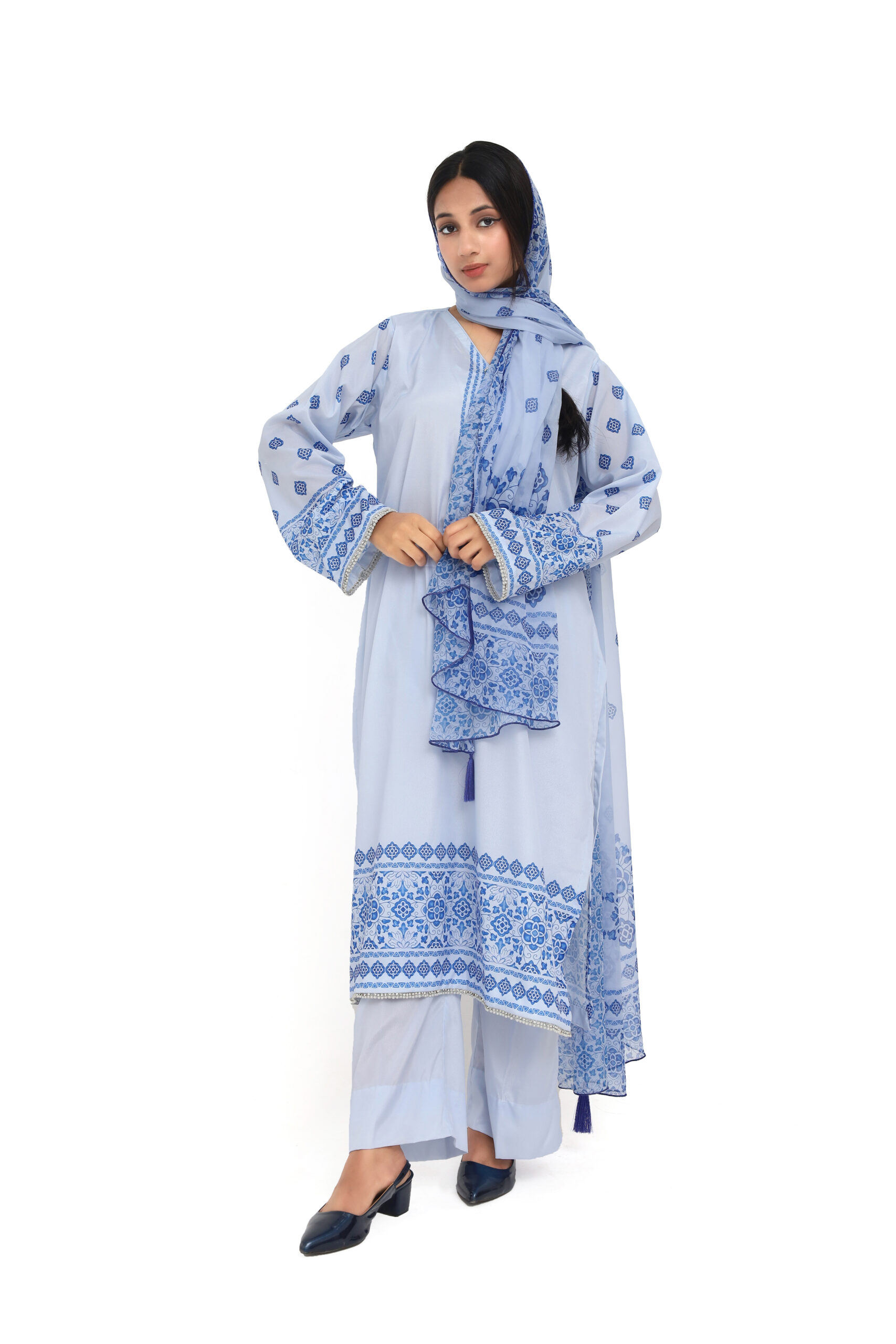 Ice blue base with bright blue sublimation printed motif on shirt and dupatta with plain ice blue trouser